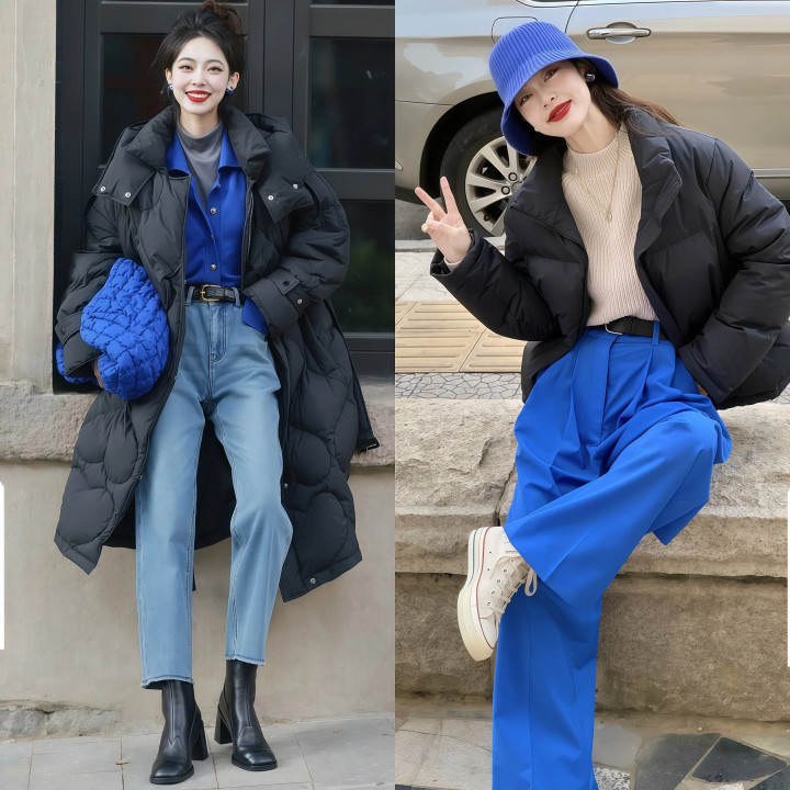 冬季羽绒服的配色思路,也是非常重要的!一件基础款式的黑色羽绒服,如果想要穿得出彩,不然离不开亮色系的衬托,比如克莱因蓝衬衫、西装阔腿裤、包包、帽子,通通都是摆脱沉闷感的秘诀。