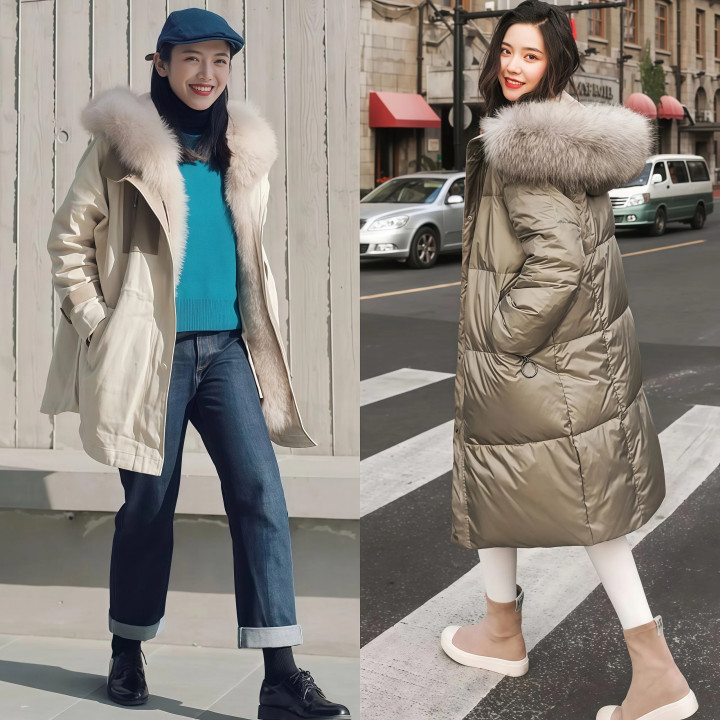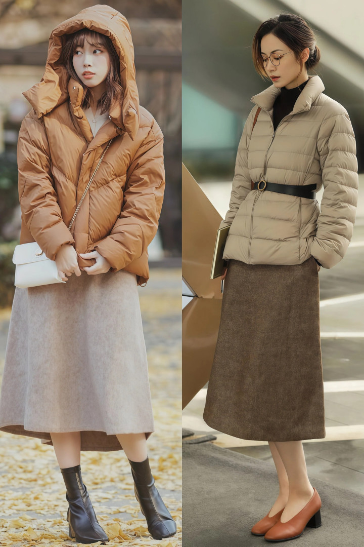 如果你特别怕冷的话,还是推荐穿长款羽绒服,但是一定要选择收腰款,腰部位置收紧,视觉上才具备显瘦显高的状态,并且很适合中年女人穿,轻松打造优雅气质,下身搭配长裙和低跟靴,姿态更优美。