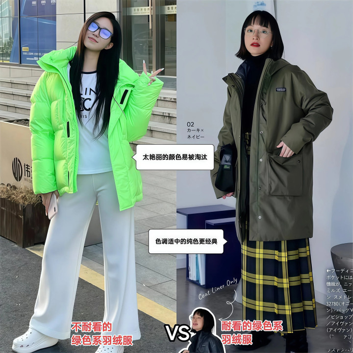 不要认为鲜艳靓丽的颜色,一定会减龄,像这种太过于扎眼的荧光绿,就特别容易被淘汰,而且还不经看。最严重的是挑剔肤色,用于羽绒服当中,会显得皮肤更黑,色调适中的橄榄绿,反而更加经典显白。