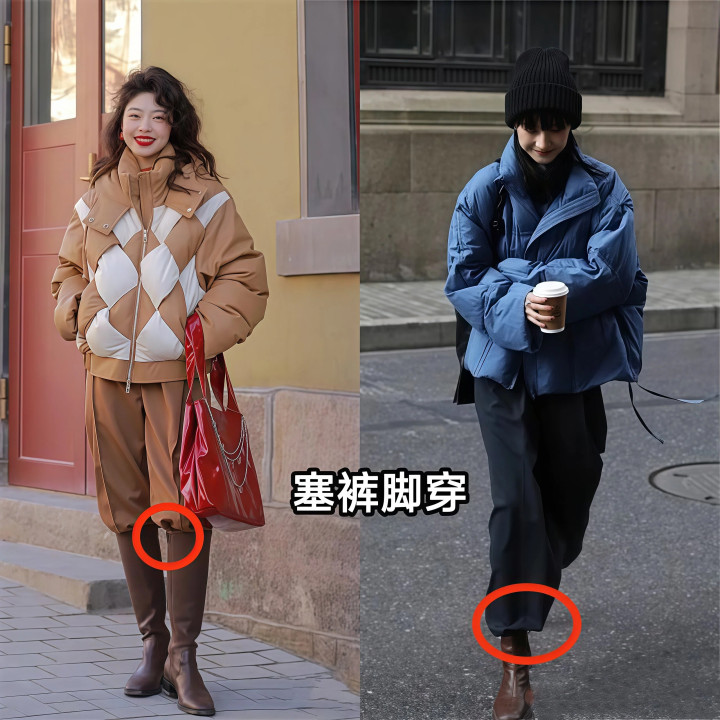 ★短款羽绒服配长款,裤腿塞进靴筒当中