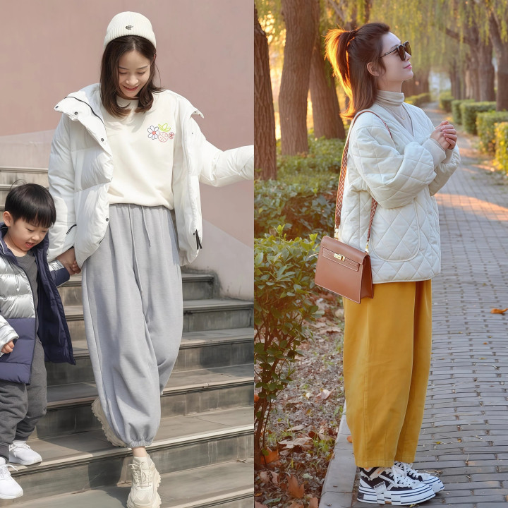 穿搭是很讲究技巧的,尤其是穿羽绒服,一定要学会强调“收缩点”,比如裤子可以选择修身款式,或者把羽绒服敞开穿,内搭塞进裤腰,勾勒出腰部线条,也可以将裤腿挽起来穿,露出纤细的脚踝。