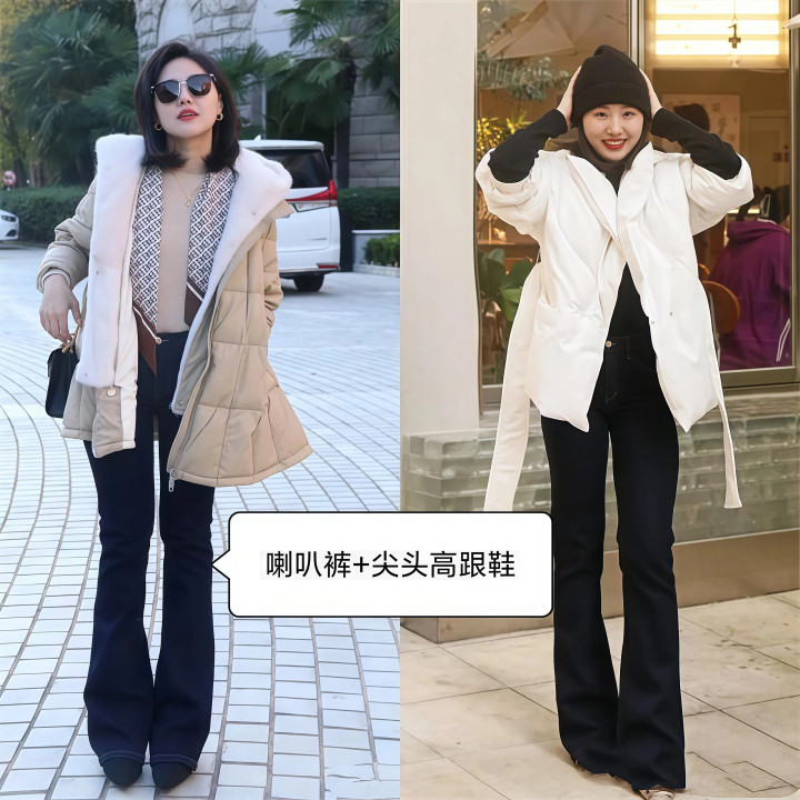★遮臀羽绒服配喇叭裤,鞋子带点低跟设计
